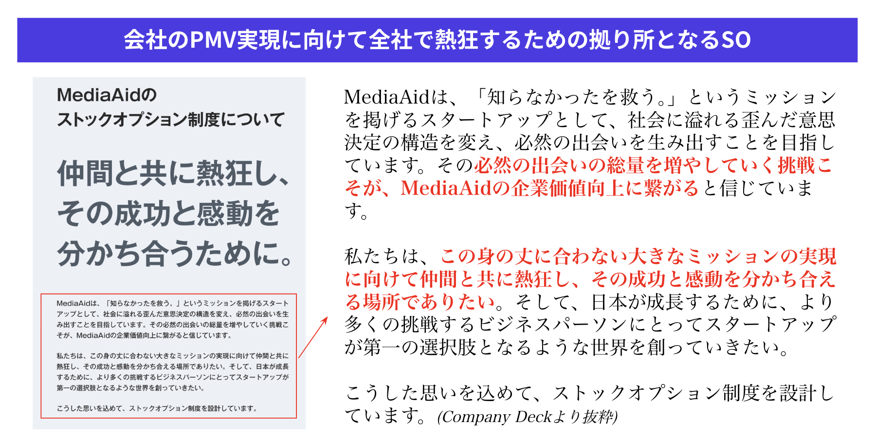 「『SOは宝くじのようなもの』と言われることがあります。しかし、メディアエイドのSOは違います。パーパスやミッション、ビジョンの達成度合いが企業価値につながり、その差分がSOによるリターンにつながる。その旨が明確にわかるように図解にしました」(COO石毛さん)