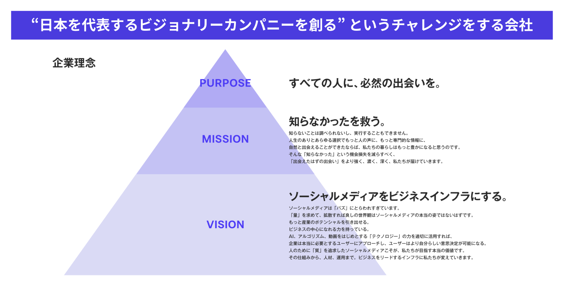 メディアエイドには「時代を超えて繁栄し続ける企業にしたい」という思想があります。2025年3月に実施した企業のリブランディングでは「すべての人に、必然の出会いを。」というパーパスと、「知らなかったを救う。」というミッション、「ソーシャルメディアをビジネスインフラにする。」というビジョンを新たに策定し、規格外の挑戦をすることを宣言しました。この挑戦には会社が一丸となる必要がある──そこで、従業員が貢献に見合った報酬を得られる手段としてSOを導入しました。