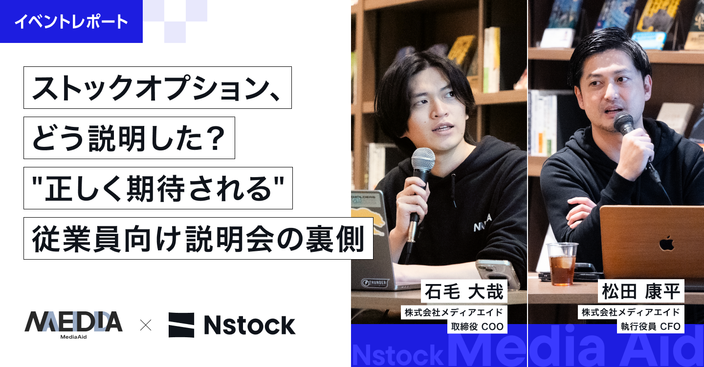 2025年10月、Nstockでは「SOの説明で社員はどう変わった?実践のリアルを聞くイベント」を開催しました。登壇したのは、「知らなかったを救う。」をミッションにSNSソリューション事業やSNSコマース&IP事業を展開する株式会社メディアエイド(以下、メディアエイド)のCFOである松田康平さんと、COOである石毛大哉さん。