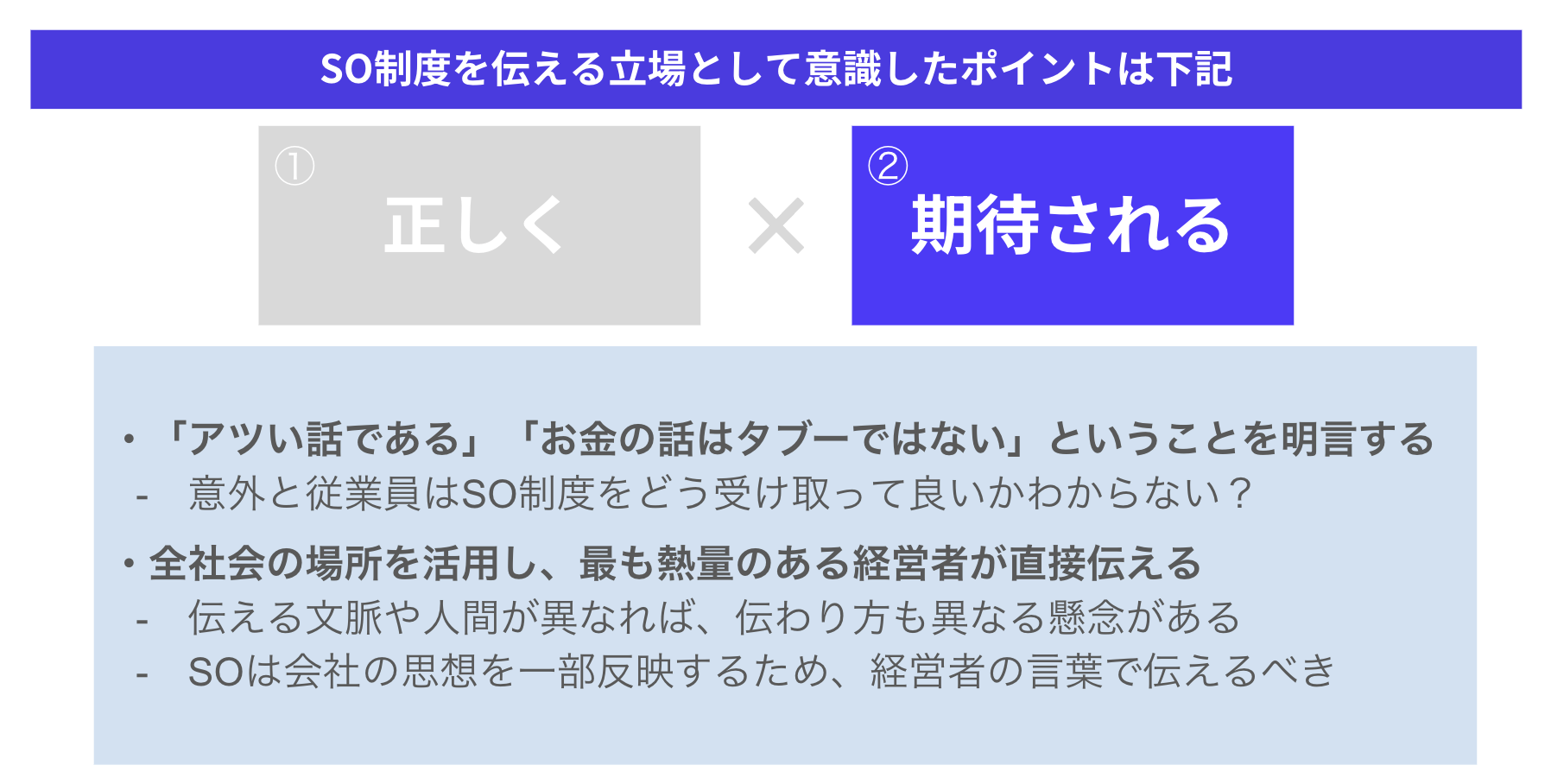 そして最後に、SOについて従業員に説明する際に大事なポイントについてCOOの石毛さんはこのように話しました。