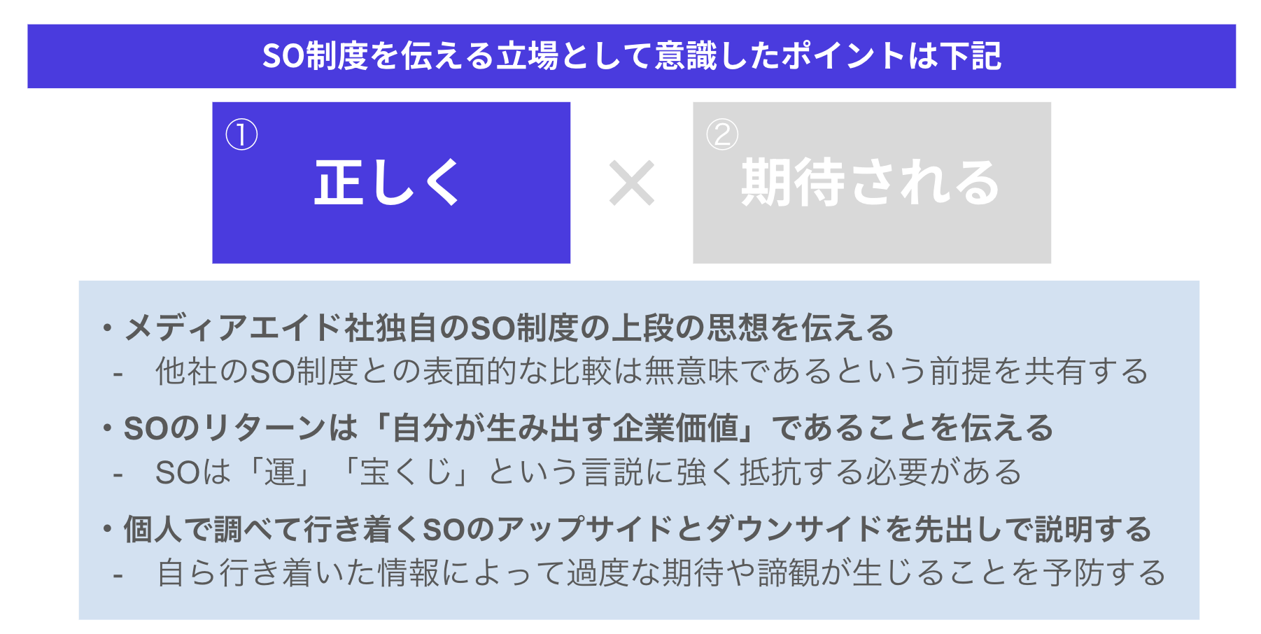 「僕らが伝えなかったとしても、SOを付与された従業員たちは自分で調べるはずです。そのときにネガティブな情報に触れて『うちのSOも紙くずになるんだ。会社は都合のいいことしか教えてくれなかった』と感じられてしまったら期待や信頼を失います。世間に広まっている光と闇のイメージを共有したうえで『どちらも事実です。だからこそ、メディアエイドのSOを正しく理解し、当事者意識を持ってどう活用するか自分で選びとってほしいです』と伝えました」(COO石毛さん)