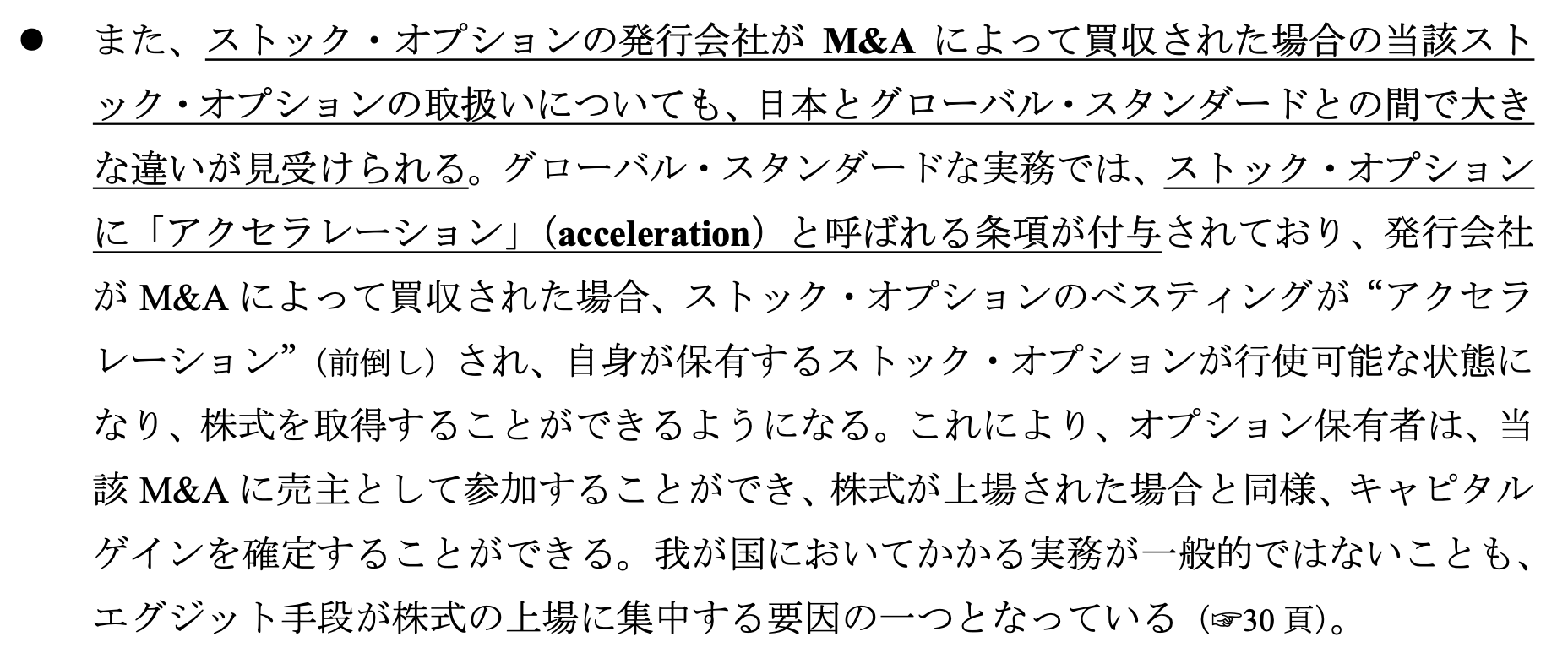 小林:そのとおりです。そしてもう1つ、注目してほしいポイントがあります。それがM&Aアクセラレーションという条項です。これは、M&A時にベスティングされていない分も含めて行使可能になるという仕組みです。米国ではSO設計内容にM&Aアクセラレーションが当たり前のように含まれていますが、日本では先ほどお話ししたようにアクセラレーションどころか「M&A時に消滅」が一般的でした。日本取締役協会のベンチャーに対する提言でも「日本でもM&Aアクセラレーションの積極的導入を図るべきだ」としていますが、国内での導入例はごくわずかですね。