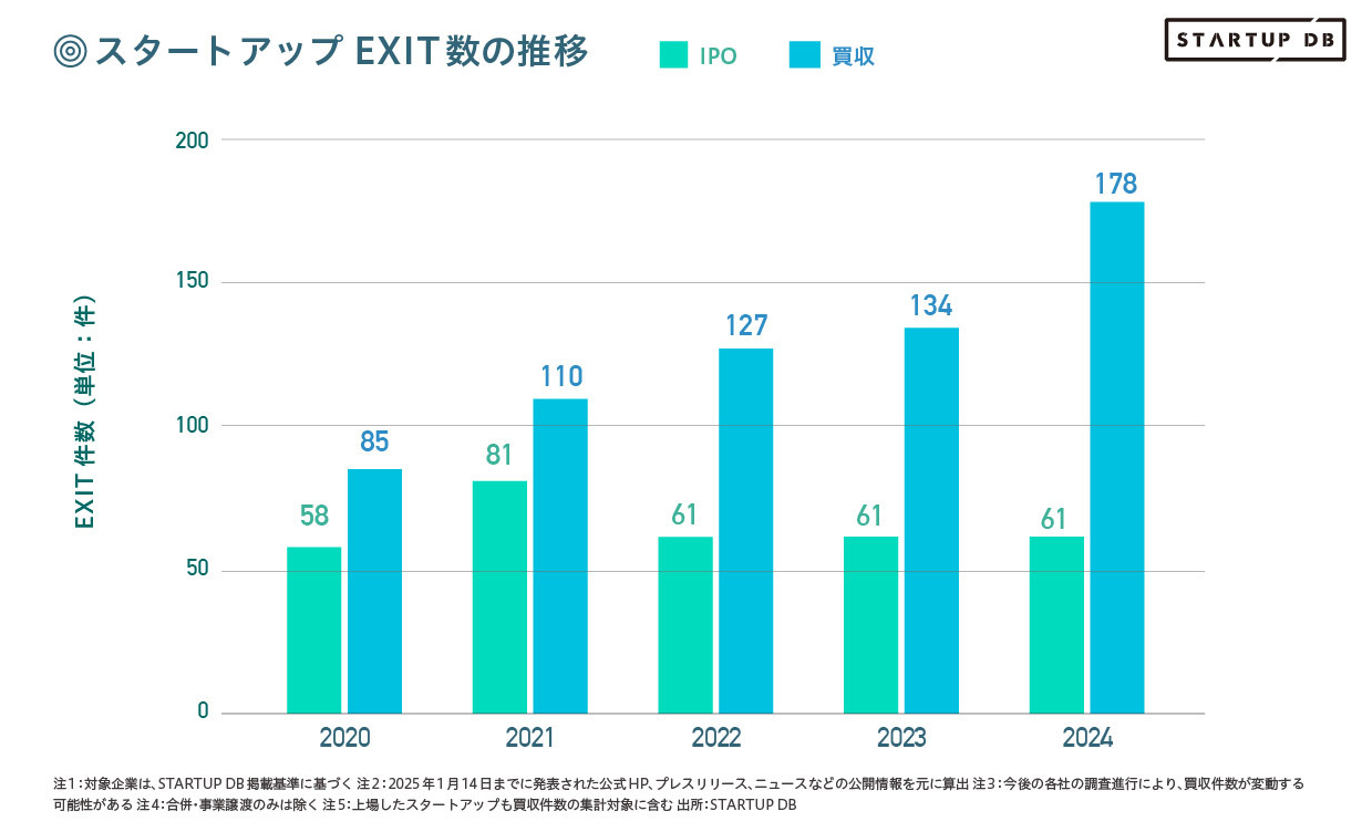 少し話は変わりますが、M&Aのアドバイザーをしている会社の方々に話を聞くと、みな一様に「過去に例を見ないほど忙しい」と言います。なかでも、、スタートアップ案件が急増しているそうです。for Startups社の統計によると、2024年のM&Aの年間件数は178件というデータがあり急増していることが伺えますが、これからもっと増えていくと思いますね。
