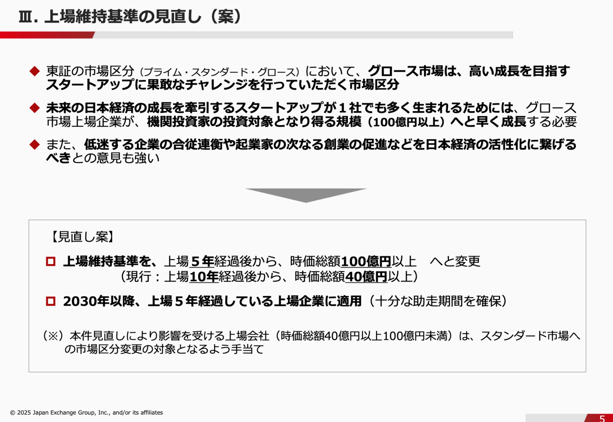 そもそも、現状の上場維持基準である「上場してから10年以上経過した際に時価総額40億円以上」が見直しされることは以前から予想されていましたが、「5年で100億円以上」という高いラインを提示したことも大きなサプライズでした。