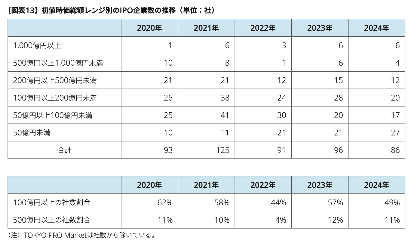 今回引き上げられるのは上場「維持」基準のみですが、上場維持基準が上がると結果的に上場基準の引き上げも起こると考えています。現在の東証グロース市場のIPOでは半数程度の企業が時価総額100億円未満(初値ベース)ですが、その規模で上場すると「上場5年後に時価総額が100億円以上」のラインを越えられない可能性が相応にあります。証券会社としては「この企業は上場5年後にグロース市場にいられなくなるかもしれないのですが、株を買ってもらえますか?」と個人投資家に営業するのは相当躊躇するのではないでしょうか。そうであれば、上場維持基準をゆうゆうとクリアできる企業に対象を絞っていく流れになっていくはずです。