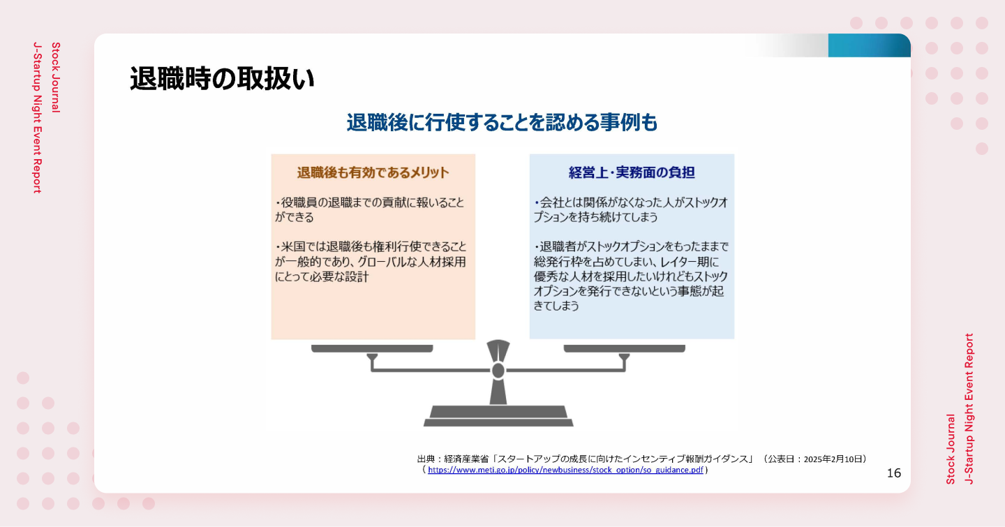 南:次のテーマに移りたいと思います。これもよく聞かれる質問ですが「退職した社員のSOはどうすべきか」というものです。退職後も権利を維持できるメリットとしては、社員のそれまでの貢献に報いられることや、(退職後の行使が一般的な)グローバル人材の採用に有効なことが挙げられます。一方で、実務面での負担が増えることや、将来重要な人材を採用する際などに必要になるSOプールが減るといったデメリットも存在します。