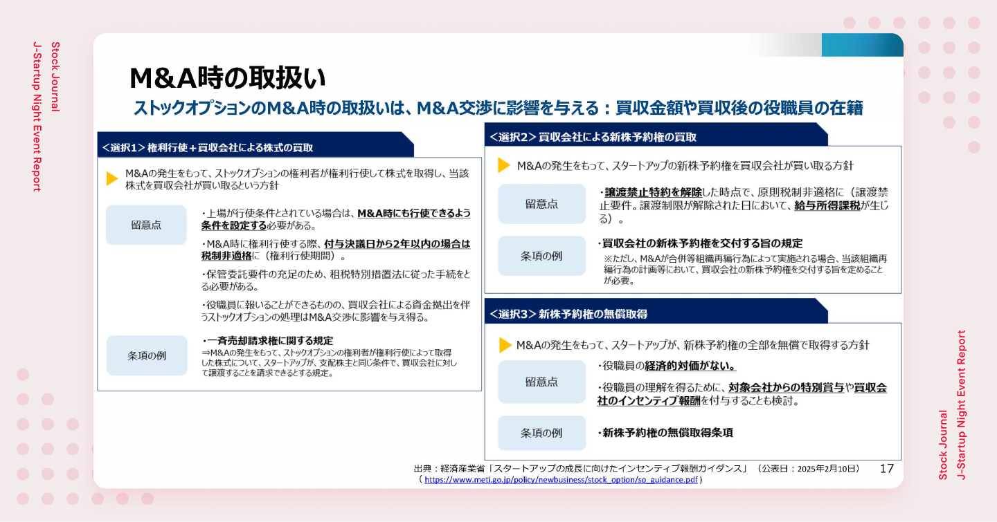 南:最後に、M&A時のSOの扱いについてお伺いします。従来はM&A時はSOが会社に無償取得(以下スライドの<選択3>)されるケースが多かったと思うのですが、最近の税制改正により、M&A前にSOを行使して株式を取得し、その株式自体を買い手に売却するという新たな選択肢(以下スライドの<選択1>)も取りやすくなりました。そもそもスタートアップにとってExitはIPOかM&Aかといった分かれ道があると思うのですが、宮田さんはスタートアップのM&Aについてどういう風に考えられていますか?