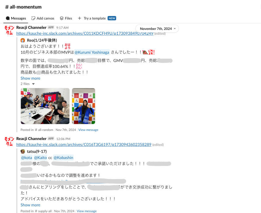 実際には、社内Slackに「#all-momentum」というチャンネルを作り、「モメンタム」の絵文字リアクションを押された投稿がそこに再投稿されるようにしました。勢いがある社員や事象がわかるようになったことで、みんなで祝いあったり励ましあったりできるようになり、さらなる盛り上がりをみせるようになったんです。その結果、3ヶ月ほどで社内の雰囲気がガラリと変わりましたね。
