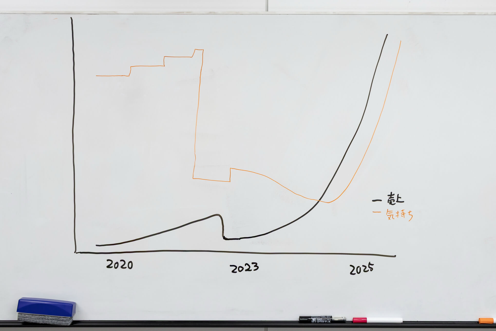 でも、ここ数年はむしろ逆で。ホワイトボードに、創業から現在までのカウシェの売上と僕の気持ちを折れ線グラフで表すとこのようになります。