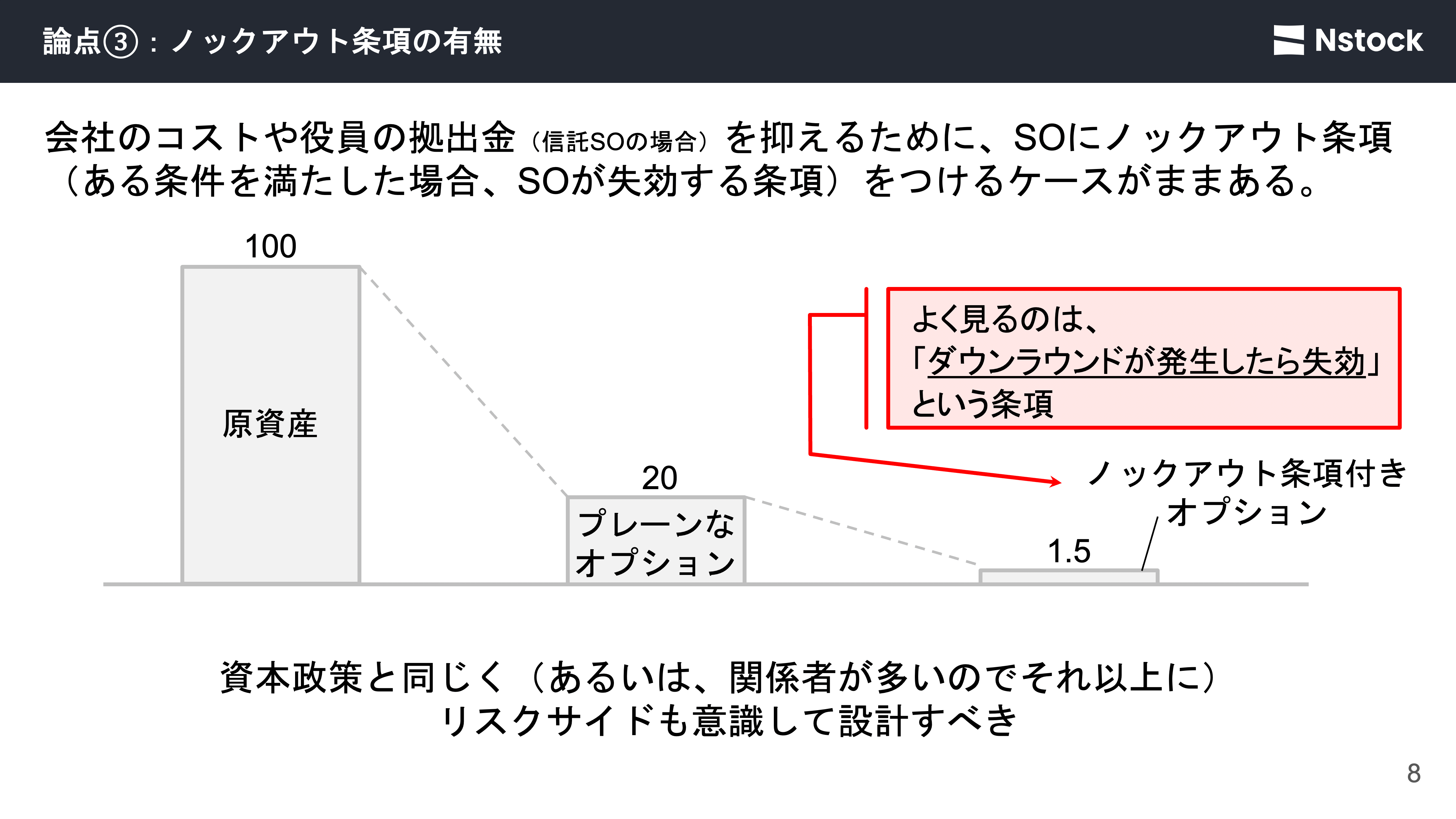 宮田:SmartHRでは過去に有償SOを発行した際、拠出金を抑えるためにノックアウト条項をつけることになったのですが、やっぱり最初におすすめされたのは「バリュエーションが下がったらノックアウト」というものでした。
