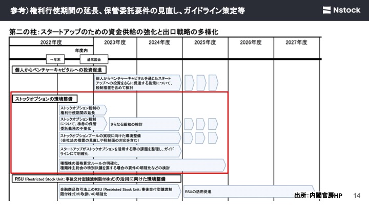 それ以外だと、日本版SOプールの実現に向けた法整備やガイドラインの策定が検討されています。ガイドラインは昨年経産省から「スタートアップの成長に向けたファイナンスに関するガイダンス」が発表されましたが、それのSO版をイメージいただければ良いかと思います。