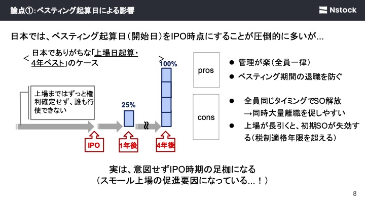 この細部の設計が違うとどうなるのかの例なんですが、日本の場合べスティング起算日をIPO時点にすることが多いというのはKIQSの解説記事にも書きました。「上場日起算4年ベスト」というのがよくありがちで、つまりIPOまでは一切権利確定しないというものです。