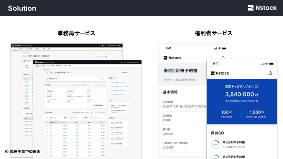 野瀬:向かって左側が事務局向けの画面です。誰にどんなSOをいつ何個どういう条件で出したかを管理できるものになっています。行使申請や行使後の株式の売却申請といった申請ワークフローも備える予定です。