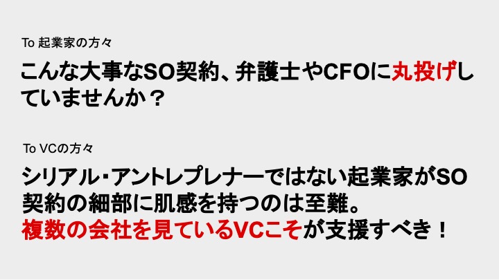 とはいえ、シリアル・アントレプレナーではない起業家がSOの詳細についてわかるかというと、さすがにわからないことも多々あるでしょうから、ここは多くのケースに触れているVCが見てあげるべきなんですよね。