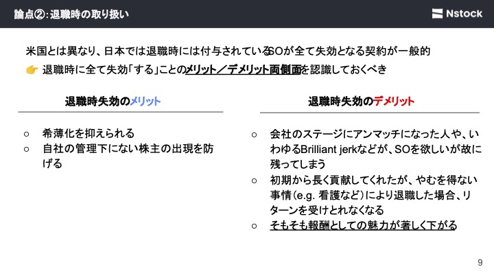 退職時失効のメリットは、まず希薄化を抑えられる点。退職時に失効しない設計だと、結果的に多くの人に付与する必要が出てきます。あとは、株主を自社の管理化における点。