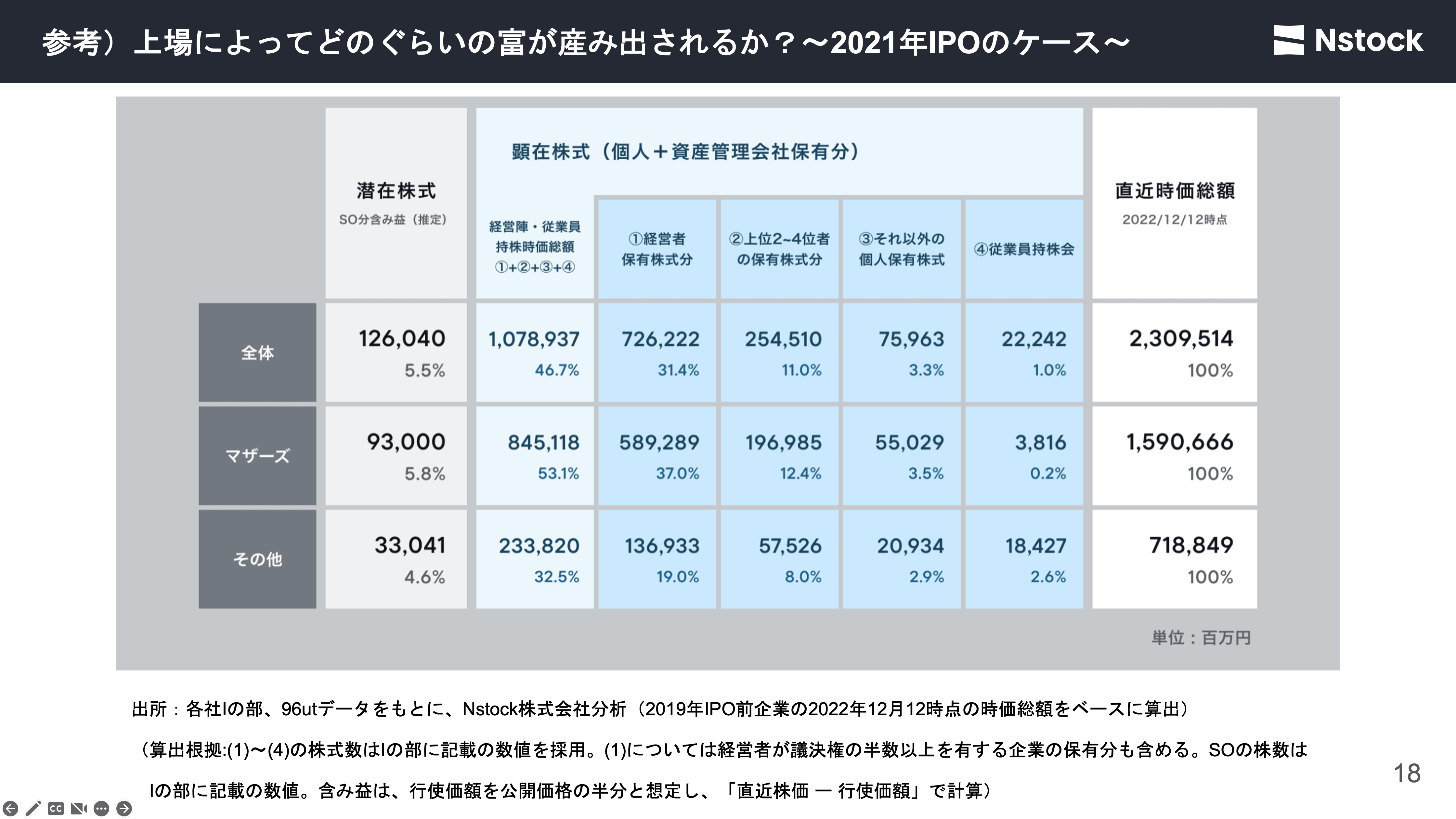 小林:これは2021年上場の全企業の株主の欄を見て、どういう人にどのくらい配布されているかを計算したものです。創業者(含む資産管理会社)、創業者以外の顕在株保有者上位2位、3位、4位の人、それ以外の個人保有株式と従業員持株会、あと潜在株式としてのSOをカウントしています。