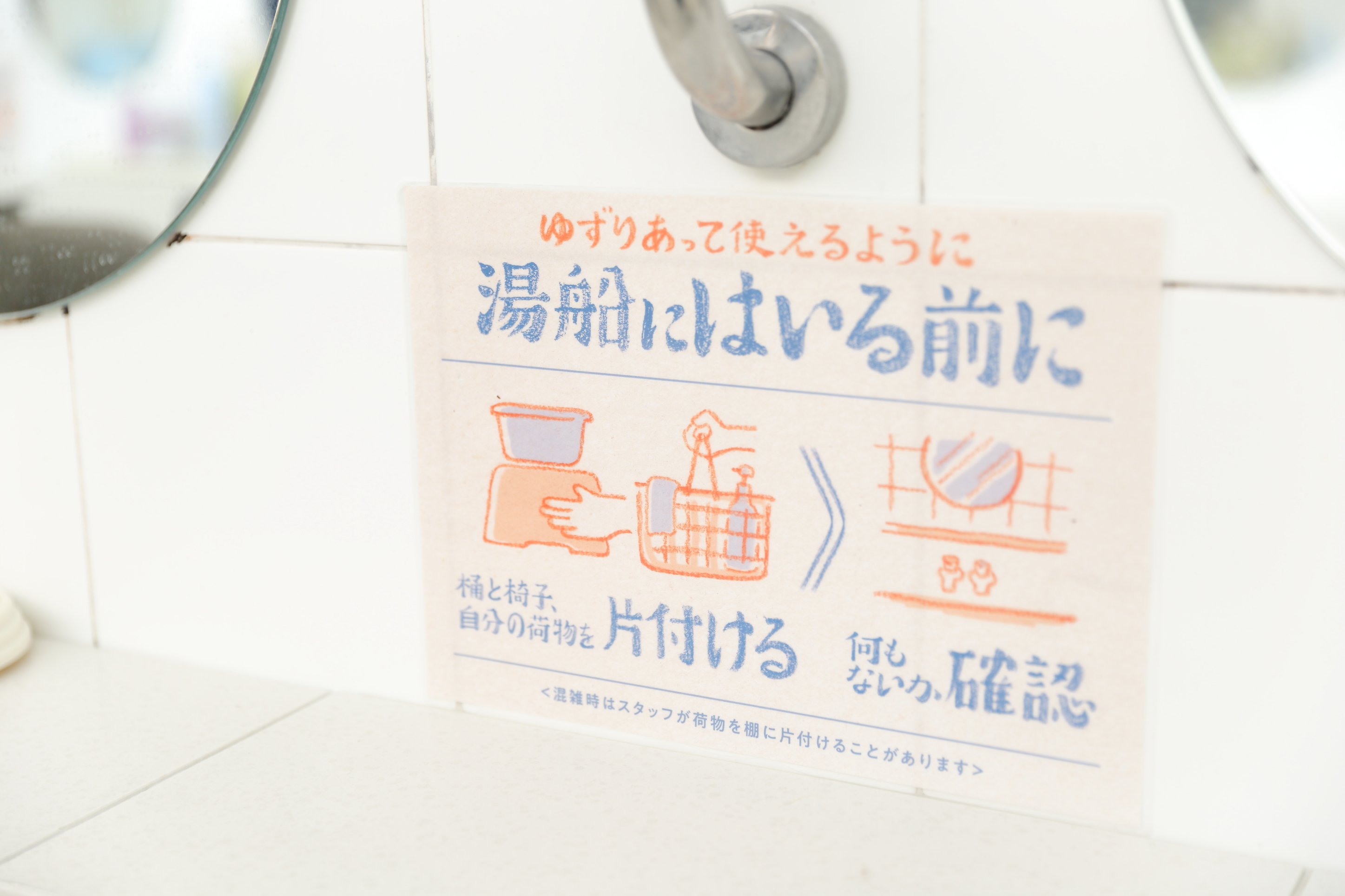たとえば、銭湯にいくと「場所取り禁止」の張り紙をよく目にしませんか?あれって字面だけでは「〜しないで!」と、ちょっと冷たく言い放たれているような印象を持っちゃう人もいるんですよね。なので、小杉湯では「場所取り禁止」を柔らかく伝えるために、このようなイラスト付きのPOPを置くことにしました。「〜禁止」ではなく「〜する前にこうしてね」と言い換えたかたちです。