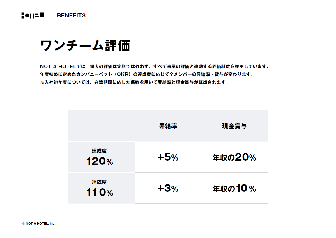 また、NOT A HOTELでは個人評価は行わず、昇給に関しては会社の業績評価によって一律で決められるようにしています。そのため、定期的な個人面談もしていません。以前の会社では、3ヶ月ごとに個人面談をして評価をして・・・というフローを採用していたのですが、定期的に評価面談を行うのはなかなか大変なんですよね。社員はそうせずとも、会社の業績を上げるために頑張ってくれている。「だったら、業績だけで評価すればいいのではないか」と考え、年次ごとに業績やOKRの達成度を見て、3% or 5%の間で一律で昇給するようにしたのです。なかには飛び級をする人もいますが、基本的にはみんな一緒に昇給するようになっています。