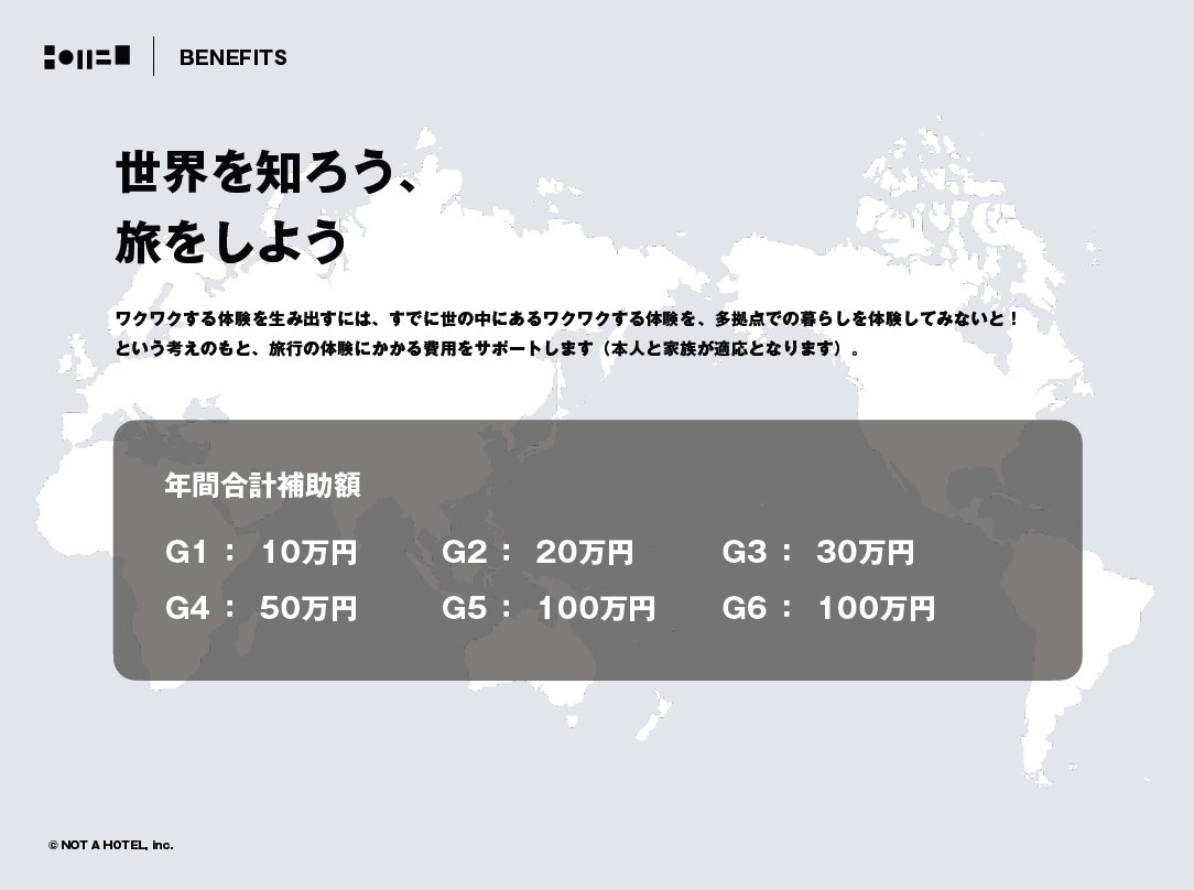 濱渦:福利厚生をかんがえるとき、たとえばメルカリのような会社の福利厚生を真似しようと思っても、スタートアップだと難しいですよね。また、せっかく作るならNOT A HOTELらしさを感じられるものにしたい。そう考えた結果、「社員本人とその家族に年間最大100万円の旅費を支給する」という、たった1つの福利厚生を取り入れることにしました。誰にでも刺さる内容ではないかもしれませんが、きっと「旅好きな人」には刺さるだろう、と。