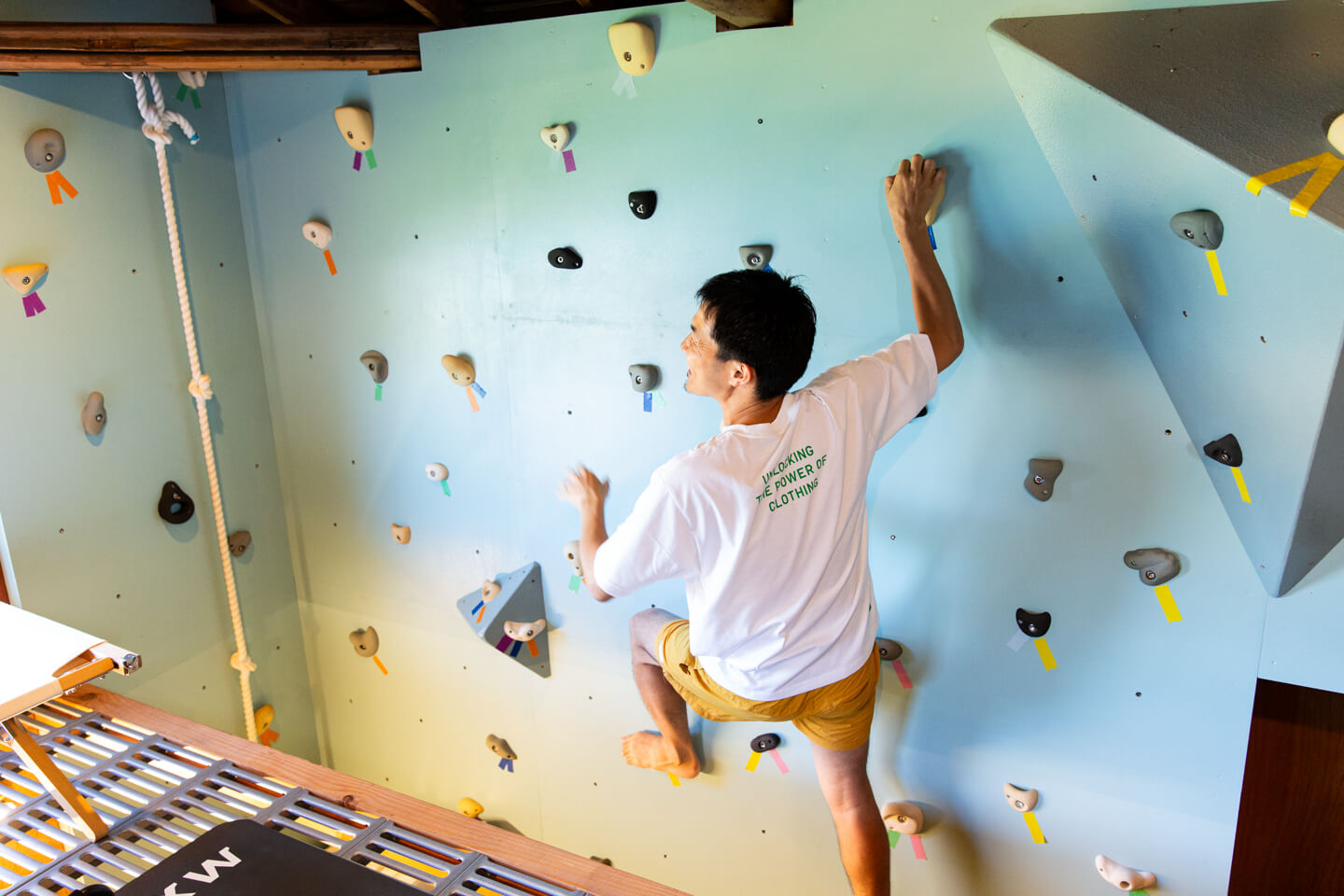 宮田:Nstockの取材ですが、もう少し家のことを教えてください(笑)。1つ目の推しポイントとして、自然豊かなところをあげていましたね。それ以外にも、お庭にバスケットゴールがあったり、屋内にボルダリングスペースを作ったりしているのは何か理由があるのでしょうか?