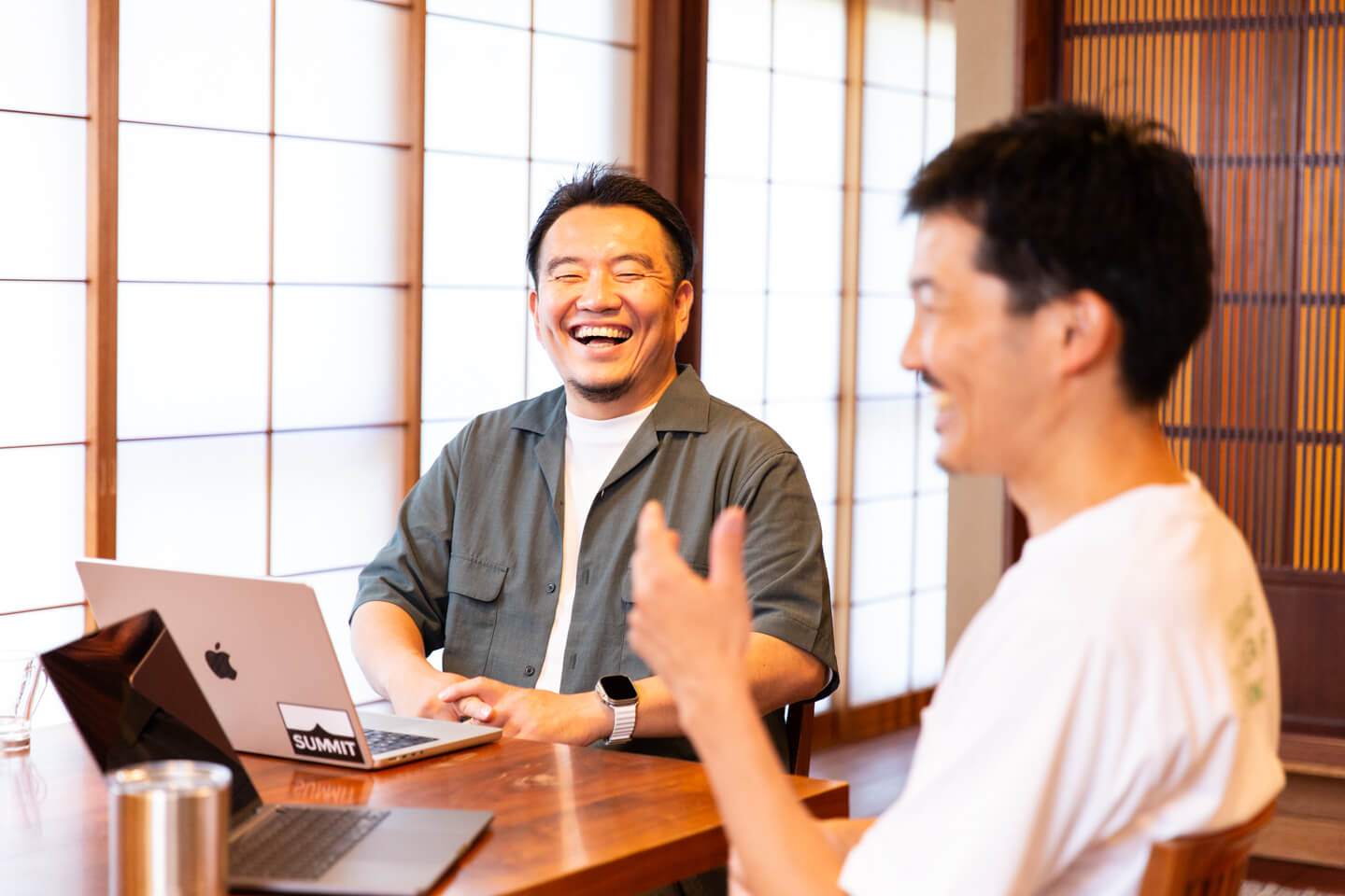 宮田 昇始(以下、宮田):SNSで石黒さんのご自宅を見て「めっちゃいい〜!」と思っていたので、今日お伺いできて嬉しいです。取材前に自宅を一周させてもらったのですが、お庭には広いウッドデッキや、焚き火やバーベキューができる芝生もあって、仕事部屋とガレージが一体化した部屋にはボルダリングの壁まで。とにかく最高ですね。さらに、緑に囲まれているからか真夏なのに涼しい!
