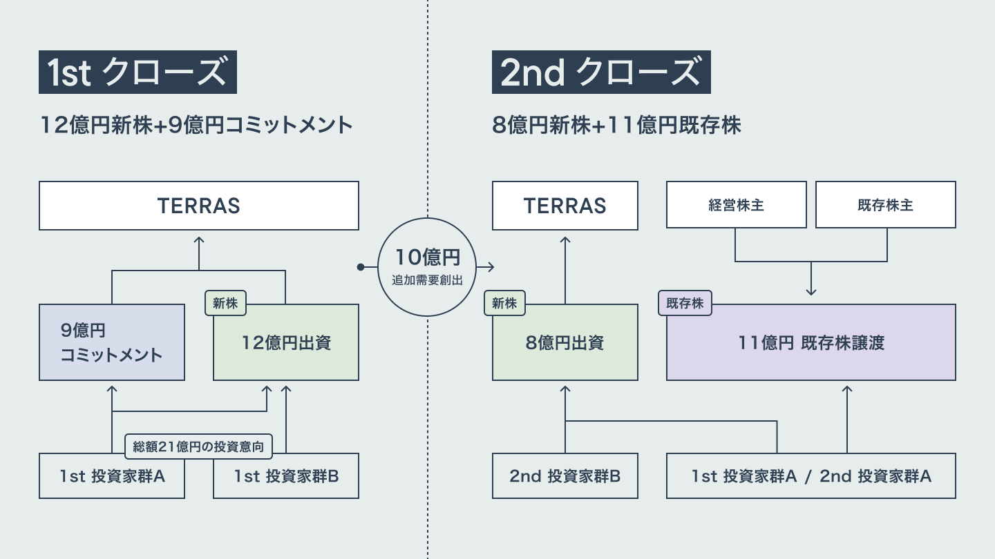 「この手法は、新規調達額を20億円に固定しつつ、超過需要を既存株取引(=セカンダリー取引)で賄うという“2段階方式”で行うものでした。正直言ってとても複雑で大変だったのですが、TERASSの今後を考えると必要不可欠な通過点でした」