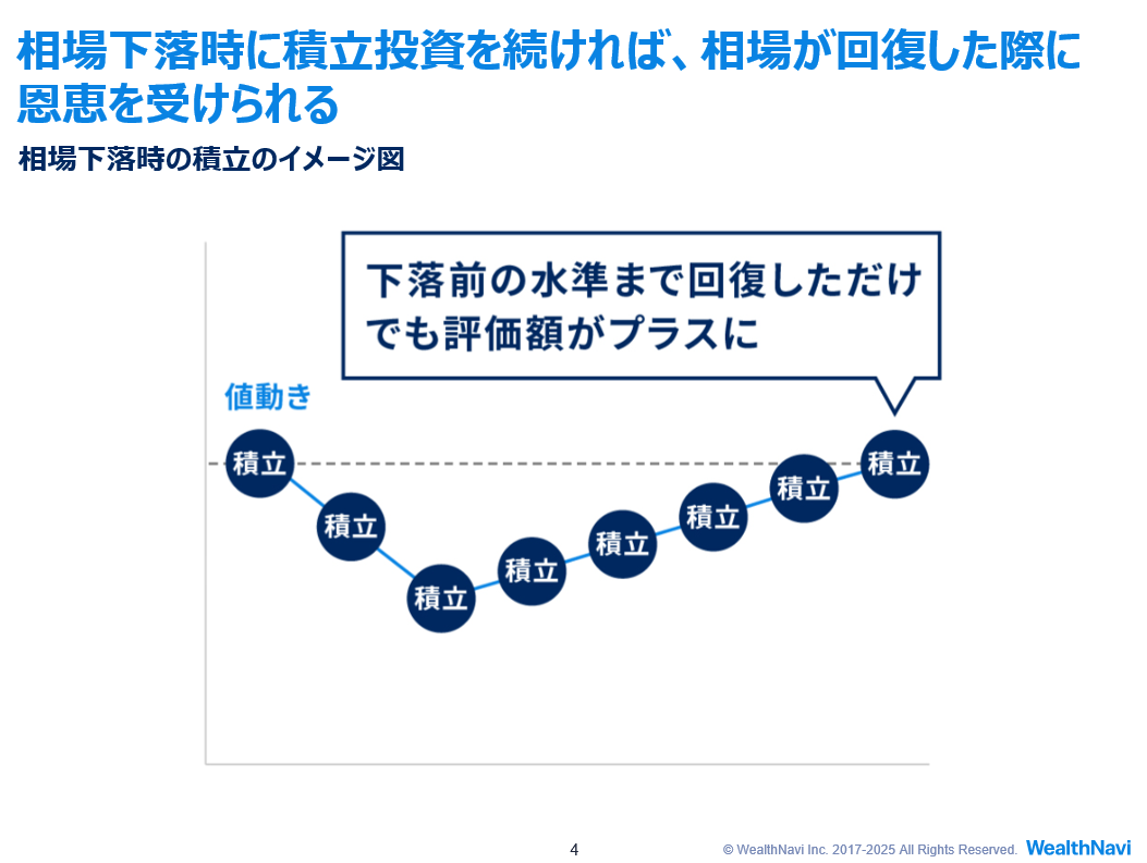 - 積立投資:リーマンショックのような暴落時も、安く買えるチャンスになる