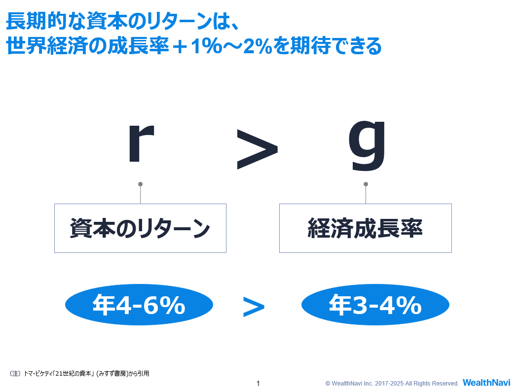 「長期分散投資」は、リスクを抑えつつリターンを最大化するための方法です。世界中のさまざまな資産に分散して10年以上投資することで、世界経済の成長率(3〜4%)を上回る4〜6%程度のリターンを目指せます。
