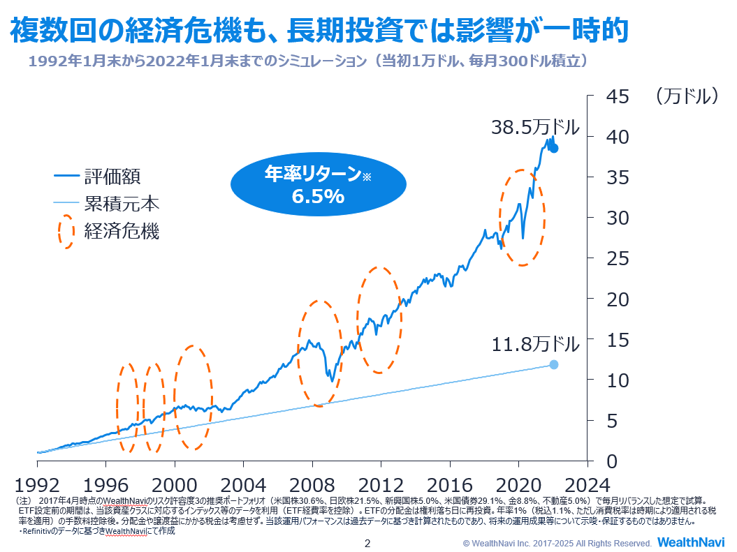 そして最後のひと押しのように強調しますが、大事なお金だからこそ資産運用ではリターンばかりに目を向けるのではなく、きちんとリスクにも目を向けるようにしましょう。自分にふさわしい特別な金融商品があるという思い込みは危険ですので、ちゃんとリスクを見極めてください。資産運用をしていくなかで時には経済危機のようなことも起こり得るわけですが、それらを乗り越えながら継続していくことが資産を築く一番の近道です。
