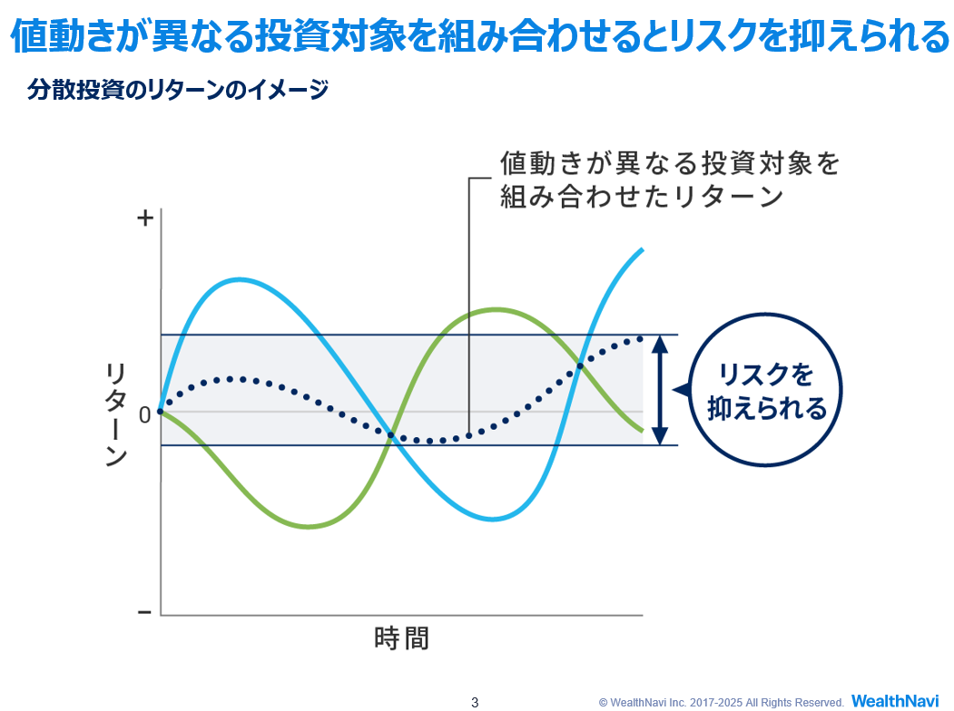 続いて「分散投資」についてです。これには複数の投資先に資金を分ける「資産の分散」と、複数の地域や通貨を組み合わせる「地域の分散」があります。投資の対象になっているものが存在している国やその通貨、地域の状況などによる値動きのリスクを軽減することができるんです。
